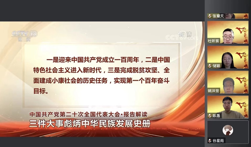 11月24日晚20:00,支部组织开展二十大精神的讲座研讨,邀请到校研究生院二十大精神宣讲团成员、文化与传媒学院2020级硕士皮福玲,以“中国式现代化——物质文明与精神文明的协调发展”为题,为党支部成员深入讲解物质文明精神文明协调发展的精神与现实意义。